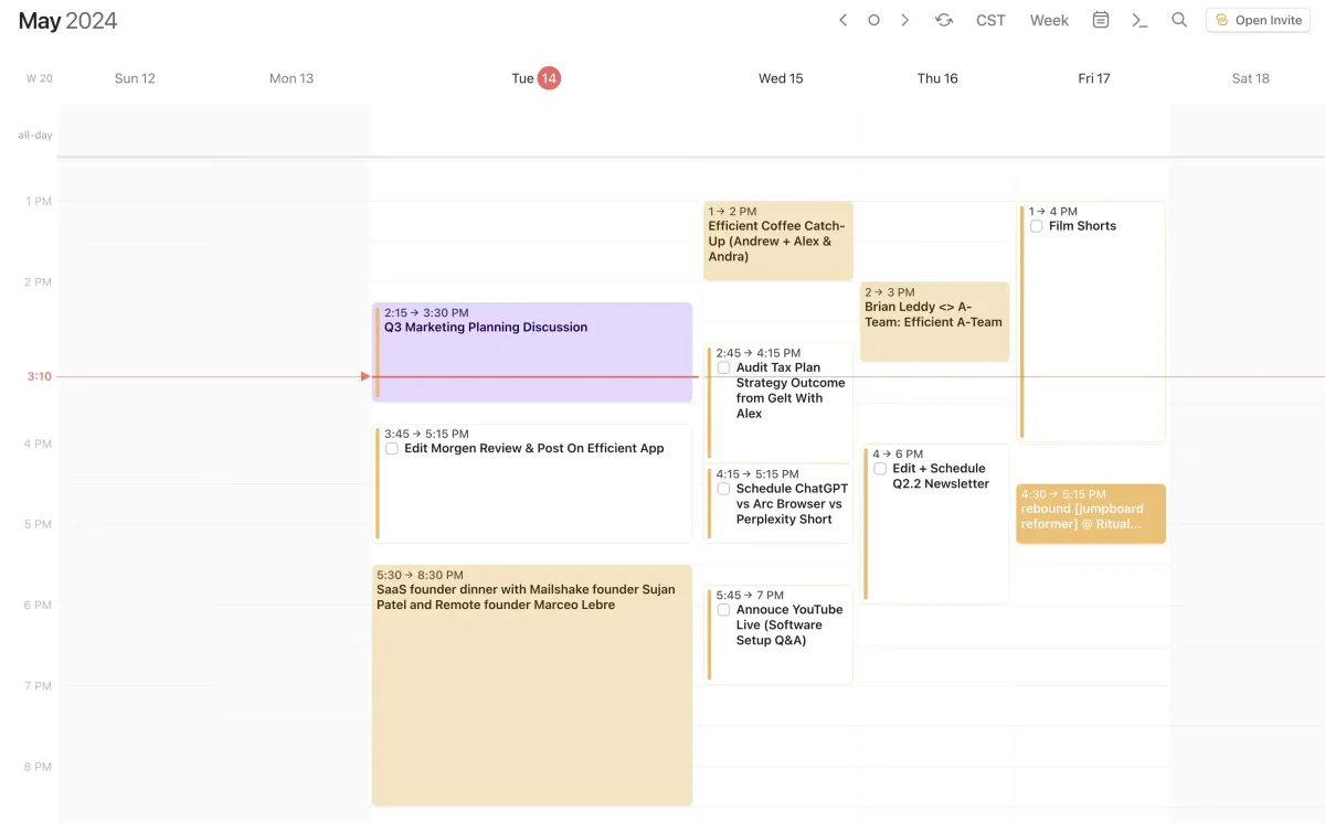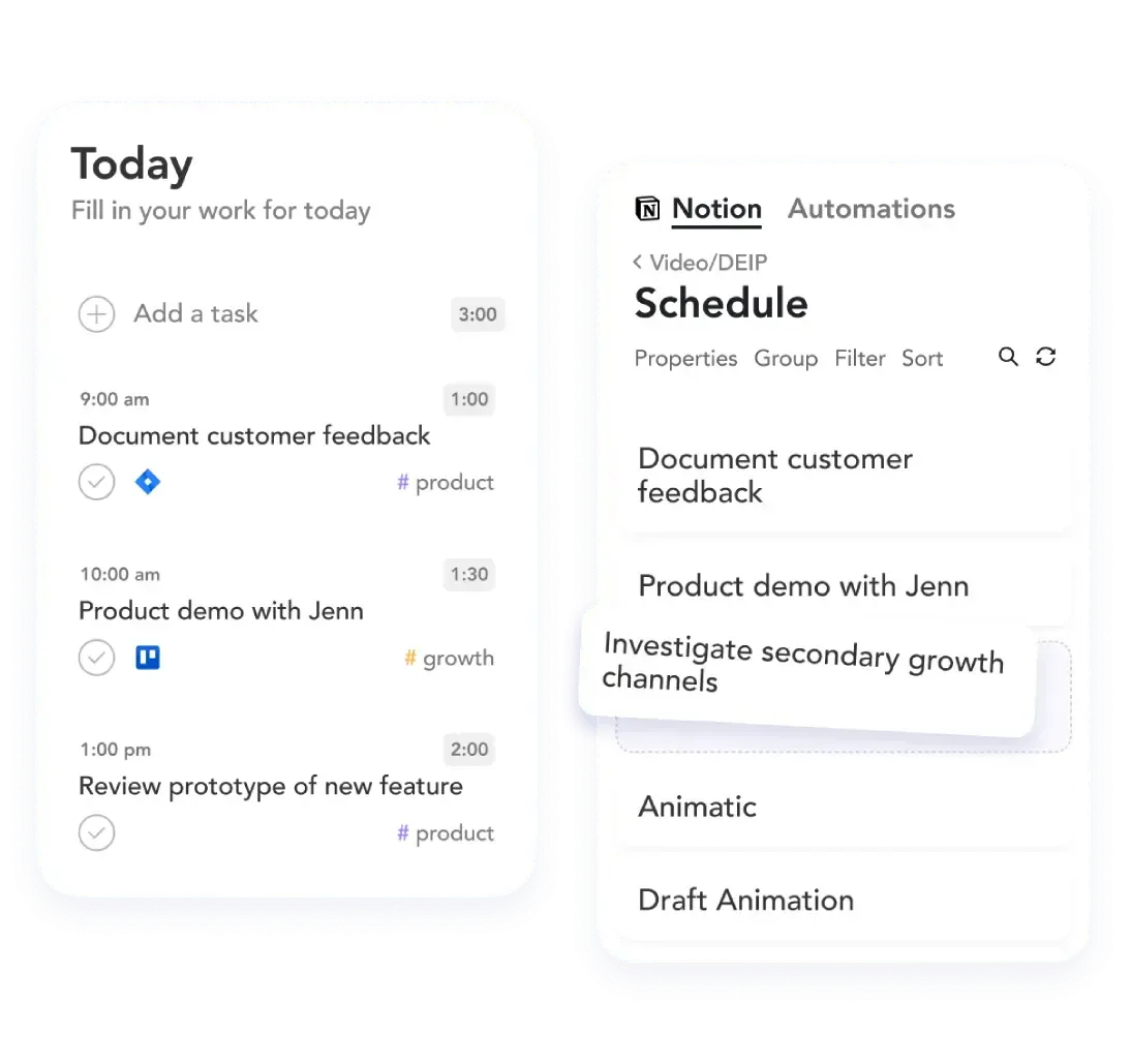 The first tool to consider (and what we use, as we don't have time for daily planning rituals when running the business), is Motion. Similar to Sunsama, Motion allows you to add in tasks but instead of you needing to manually plan your day, you just tell Motion the priority, deadline, start date, and it will automatically schedule the task into your day. What is this experience like? Well, you wake up, look at your calendar, and you see what you need to work on for that day. It's the closest thing to having and assistant. For us as a team, it more than pays for itself in the time it saves us.
