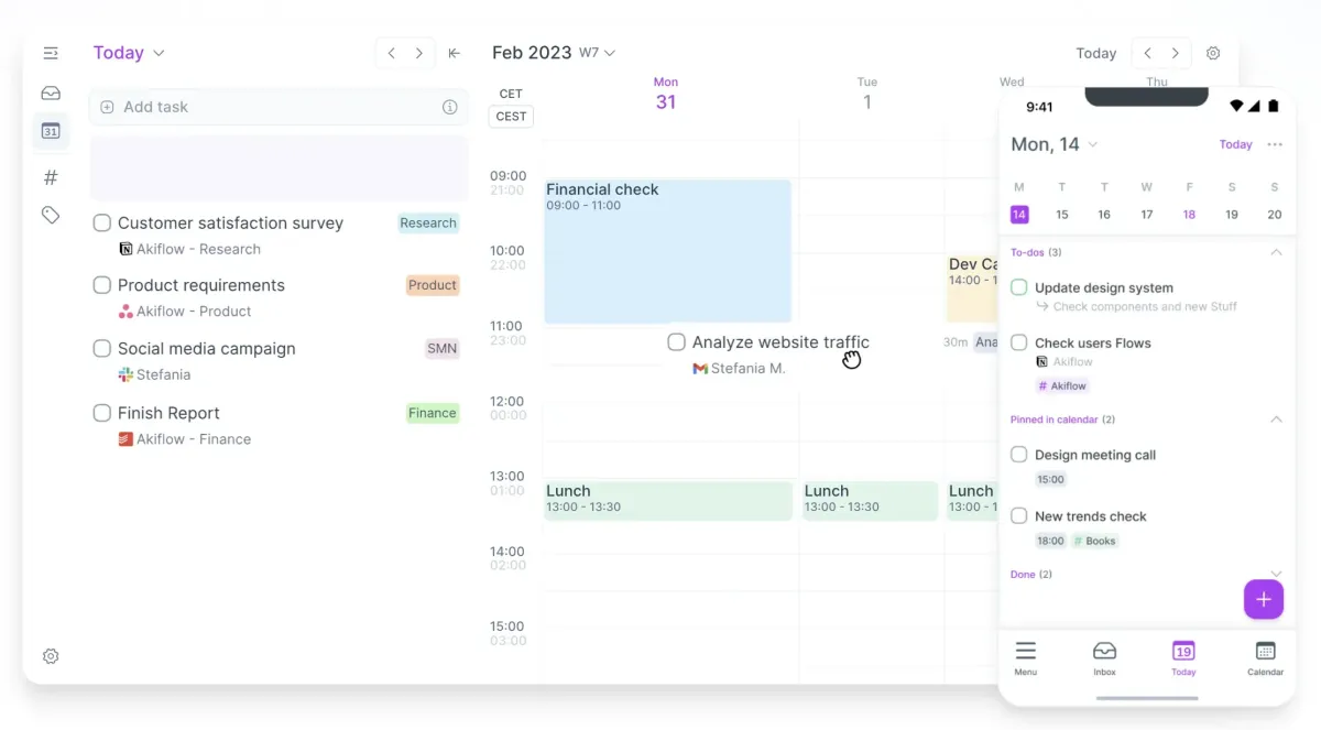Akiflow's powerful command bar allows you to plan tasks into time blocks on your calendar, snooze tasks, mark as done or assign labels for categorizing tasks. You can do all this through keyboard shortcuts, without even touching your mouse.